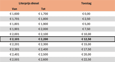 Het zal u ongetwijfeld niet zijn ontgaan dat de wereldwijde instabiliteit de afgelopen periode heeft geleid tot forse prijsstijgingen van grond- en brandstoffen. Naast olie-gerelateerde producten is ook de literprijs van diesel aanzienlijk gestegen. Waar de prijs in oktober vorig jaar nog € 1,604 per liter bedroeg (grootverbruik), is deze inmiddels opgelopen naar € 2,224 per liter. Als gevolg van deze ontwikkeling zijn wij genoodzaakt een deel van deze kosten door te berekenen in de vorm van een energietoeslag. Zodra de dieselprijs weer onder het niveau van € 1,700 per liter komt, komt deze toeslag te vervallen.